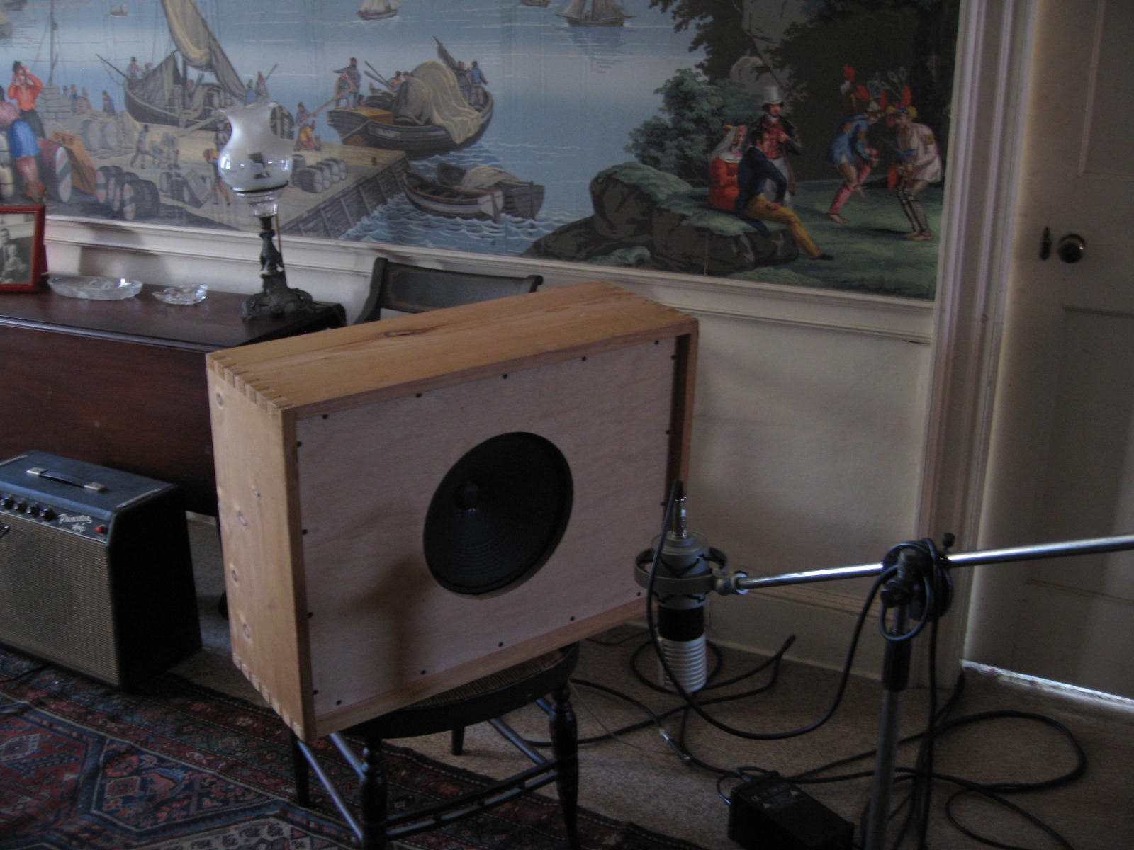 Mic'd cab for the guitars, '60s-era alnico-magnet Jensen in pine cabinet made from the Epaphras kitchen floor's leftover boards.
